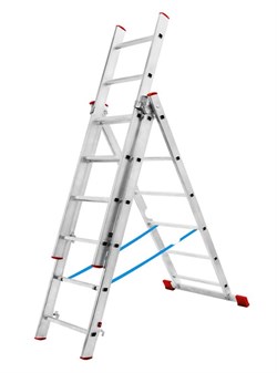 Алюминиевая трехсекционная лестница АЛ 3х12 П70 предназначена для бытового и профессионального использования. Может использоваться как выдвижная, приставная и раздвижная лестница или стремянка. Устойчива к прогибу и раскачиванию. Компактна при хранении и транспортировке. Прочные направляющие и фиксаторы обеспечивают удобную трансформацию лестницы. Широкая поперечная траверса с наконечниками увеличивает опорную площадь на 55%. Самофиксирующиеся крюки-защёлки надёжно закрепляют секции и препятствуют их произвольному выскальзыванию при работе и транспортировке. Устойчивые к атмосферным воздействиям нейлоновые ремни препятствуют нежелательному раздвижению лестниц в рабочем положении. Ярко-красные заглушки закрывают торцы направляющих и маркируют габариты лестницы. Гарантированная нагрузка на ступень - 150 кг.