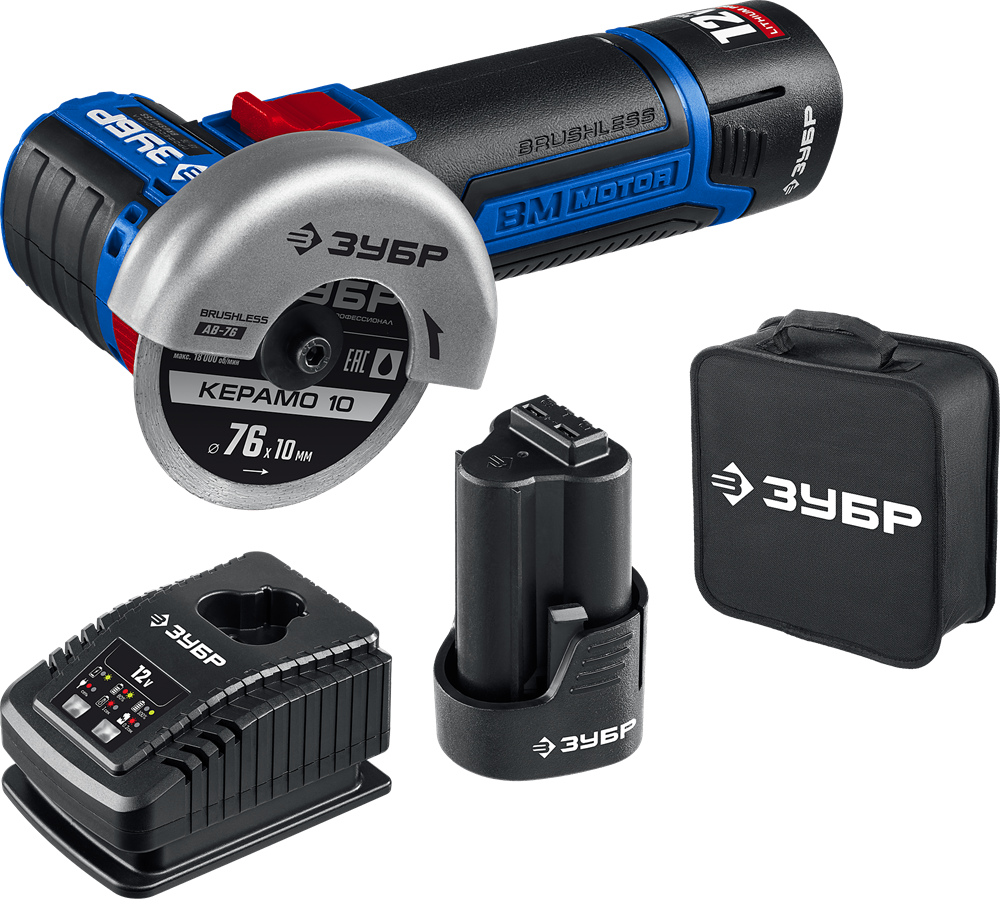 ЗУБР Т7, 12 В, d76 мм, 2 АКБ (2 А·ч), бесщеточная УШМ, сумка, Профессионал (AB-76-22)
