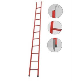 Лестница стеклопластиковая приставная Оникс ЛСП-3,8AКМ крюки, металлические оконцеватели, с абразивным покрытием ступеней h=3850мм производится в соответствии с требованиями СТО 34.01-30.1-001- 2016 (Порядок применения электрозащитных средств в электросетевом комплексе ПАО "Россети"). Используется электроизоляционный стеклопластиковый профиль со специальным составом для защиты от УФ- лучей красного заметного цвета без необходимости дополнительного покрытия краской и/или лаком.