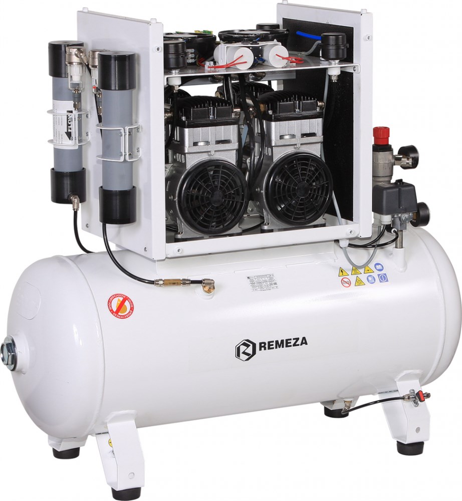 - Тандемный поршневой безмасляный компрессор медицинского назначения с двумя рабочими насосами на одном горизонтальном ресивере для повышенной производительности и стабильности давления;
