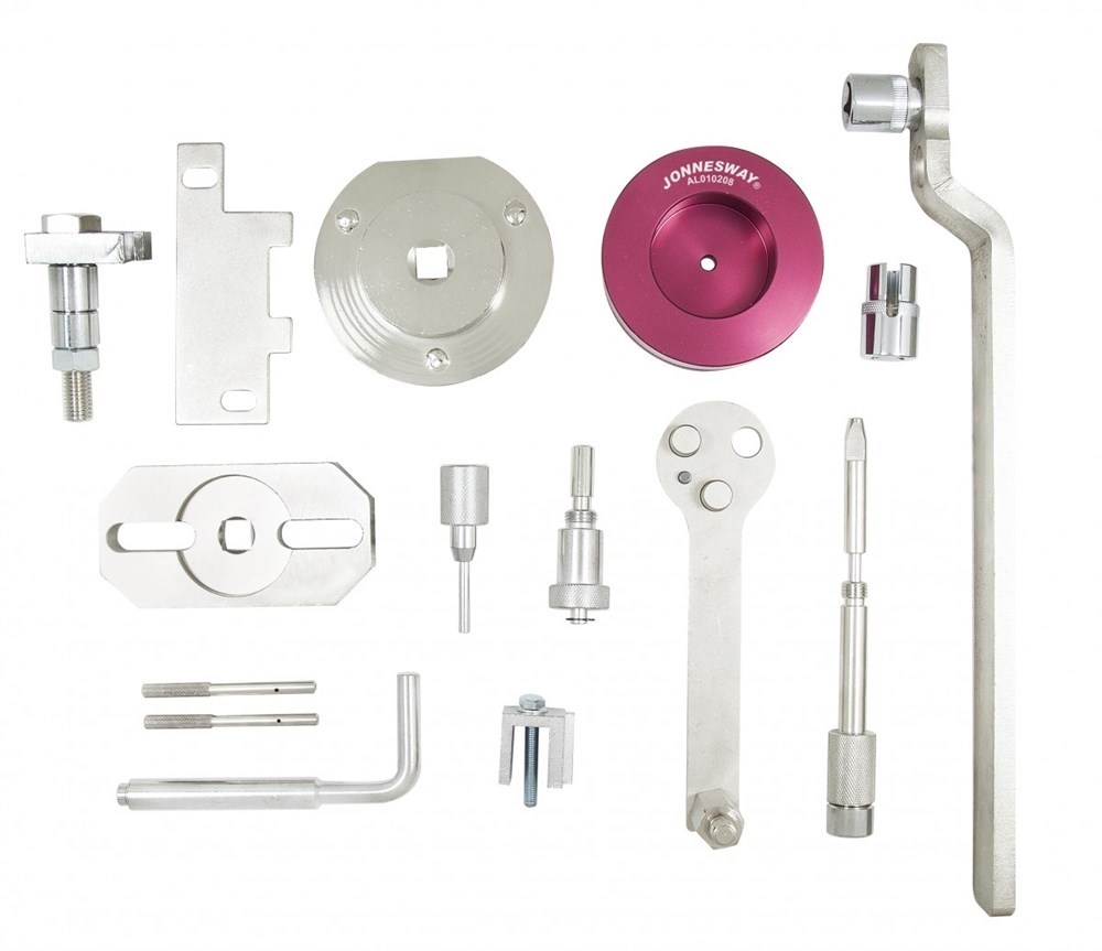 Набор приспособлений для установки фаз ГРМ двигателей коммерческих а/м FIAT/IVECO/FORD Jonnesway AL010208 применяется для настройки фаз газораспределительного механизма и демонтажа гидроусилителя рулевого управления двигателей коммерческих автомобилей Fiat / Iveco / Ford / Peugeot / Citroen, объемом 2,2 / 2,3 / 3,0 литра (HDI или HPI). ГУР.