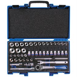Комплектация Головки и принадлежности 3/8" Короткие 6-гранные 3335M 6, 7, 8, 9, 10, 11, 12, 13, 14, 15, 16, 17, 18, 19, 20, 21, 22, 24 мм Короткие Е-стандарт 3375M E4, E5, E6, E7, E8, E10, E11, E12, E14, E16, E18 Трещотка флажковая с кнопкой 3771-08G 32 зубца, 200 мм Вороток с шарниром 3453-08F 200 мм Вороток скользящий Т-типа 3571-08 200 мм Удлинители с шаровым окончанием 15° двухпозиционные 3293 75, 150 мм Кардан 3792 56,5 мм Насадки торцевые 3/8" 50 мм TORX 3023 T8, T9, T10, T15, T20, T25, T27, T30, T40, T45, T50 — — — Ложемент 85821532B 375×187 мм (№8) Пластиковый кейс 820003 389 × 230 × 66 мм Технические характеристики Материалы – инструментальная сталь Cr-V, хром, PP+TPR (рукоять трещотки), EVA (ложемент), пластик ABS (кейс) Размеры кейса – 389 × 230 × 66 мм Вес – 2,47 кгХарактеристики