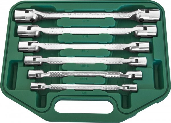 Набор торцевых карданных ключей Jonnesway в кейсе, 8-19 мм, 6 предметов W43A106S - набор гаечных ключей, объединяющих в своей конструкции вороток, удлинитель с шарниром и торцевой головкой. Используются, в основном, при массовом производстве и применении на однотипных или сопредельных по размерам крепежах вместо сборного инструмента. Удобны в ограниченном рабочем пространстве. Ключи изготовлены из хромованадиевой стали, закалены, имеют хромоникелевое покрытие.