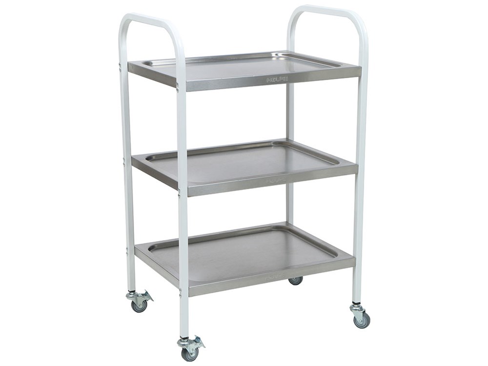 - Гигиена и безопасность: поверхность легко очищается от дезинфицирующих средств протиранием; нержавеющая сталь предотвращает коррозию и поддерживает высокий уровень санитарии; тормоза на двух колесах фиксируют положение для безопасного использования.