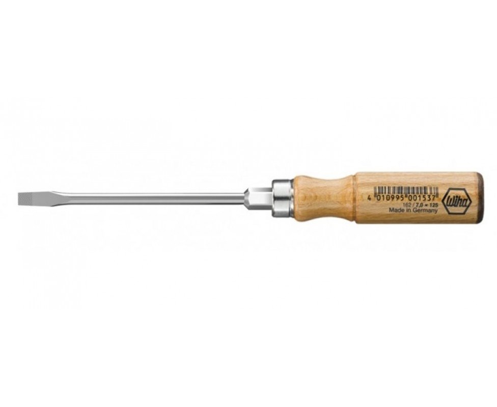Столярная шлицевая отвертка Wiha 162 SL 9,0x150 00154 с профилем прямой шлиц из хромванадиевой стали и рукояткой из бука отлично подходит для повседневных работ в различных средах. Торец ручки защищен высококачественной кожаной крышкой. Используется в повседневных работах в промышленности и мастерских.