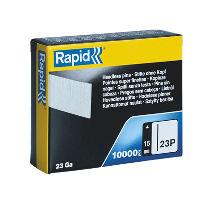 Супертвердые закаленные гвозди RAPID тип 23P 15 мм 10000 шт предназначены для отделочных работ, требующих предельной точности, таких как установка тонких молдингов, обрамлений дверей и окон, декоративной отделки, работы с тонкими деревянными основами и легкой мебелью.