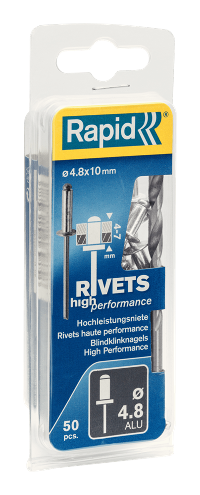 Заклепка из алюминия RAPID d4,8x10мм 50 шт 5000387 идеально подходит для закрепления элементов, которые могут находиться в незащищенных местах, таких как брызговики, металлические и пластиковые покрытия, вывески и металлические листы. Сверло соответствующего размера входит в комплект поставки.