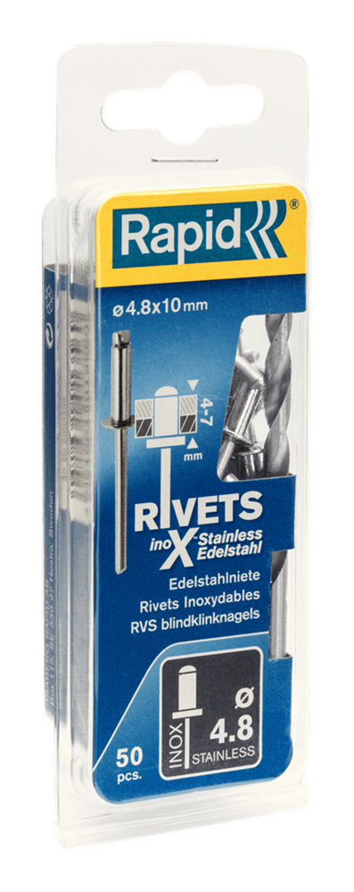 Заклепка из нержавеющей стали RAPID d4,8x10мм 50 шт 5000396 изготовлена из очень твердого материала, который рассчитан на больший срок службы, нежели соединяемые материалы.